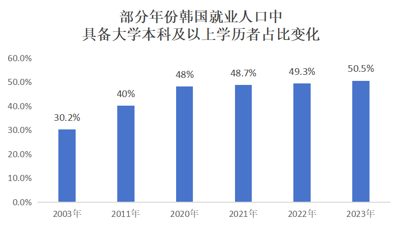 2023年,韓國統計廳國家統計門户和Microdata的數據顯示,韓國的就業人口總數為2841.6萬人,其中具備大學本科及以上學歷者為1436.1萬人,佔比50.5%。