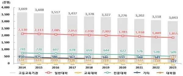 韓國教育部和韓國教育開發院公佈的《2023年教育基本統計調查結果》顯示,韓國高校在籍學生總數為3042848名。