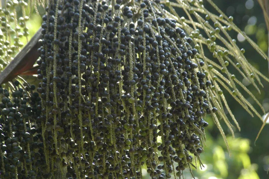 它是一種叫千葉菜棕的棕櫚樹結的果實。這種棕櫚樹可以長到25米高,直徑只有1~2釐米左右的巴西莓就成串長在這些巨木的枝頭,感覺還挺萌的。