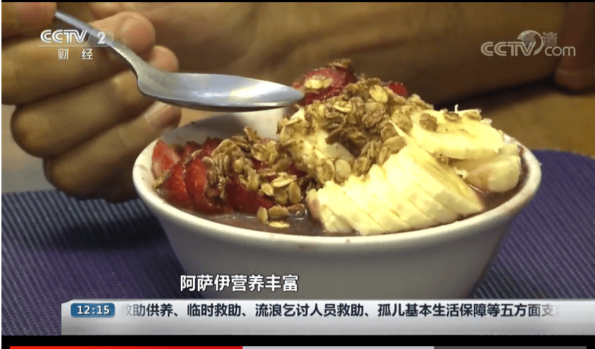 中央電視台財經頻道做過一期節目,介紹巴西的特色美食,阿薩伊碗Açaí na tigela(也叫巴西莓碗),冰鎮的巴西莓果醬,搭配麥片、香蕉等水果製成的,的確是可以當一頓飯吃了。