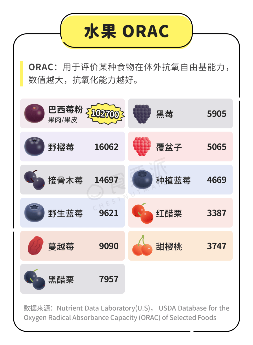 根據美國農業部的數據,巴西莓粉的抗氧化能力非常強,跟其他新鮮莓類水果的鮮果相比不在一個數量級上了[4]。