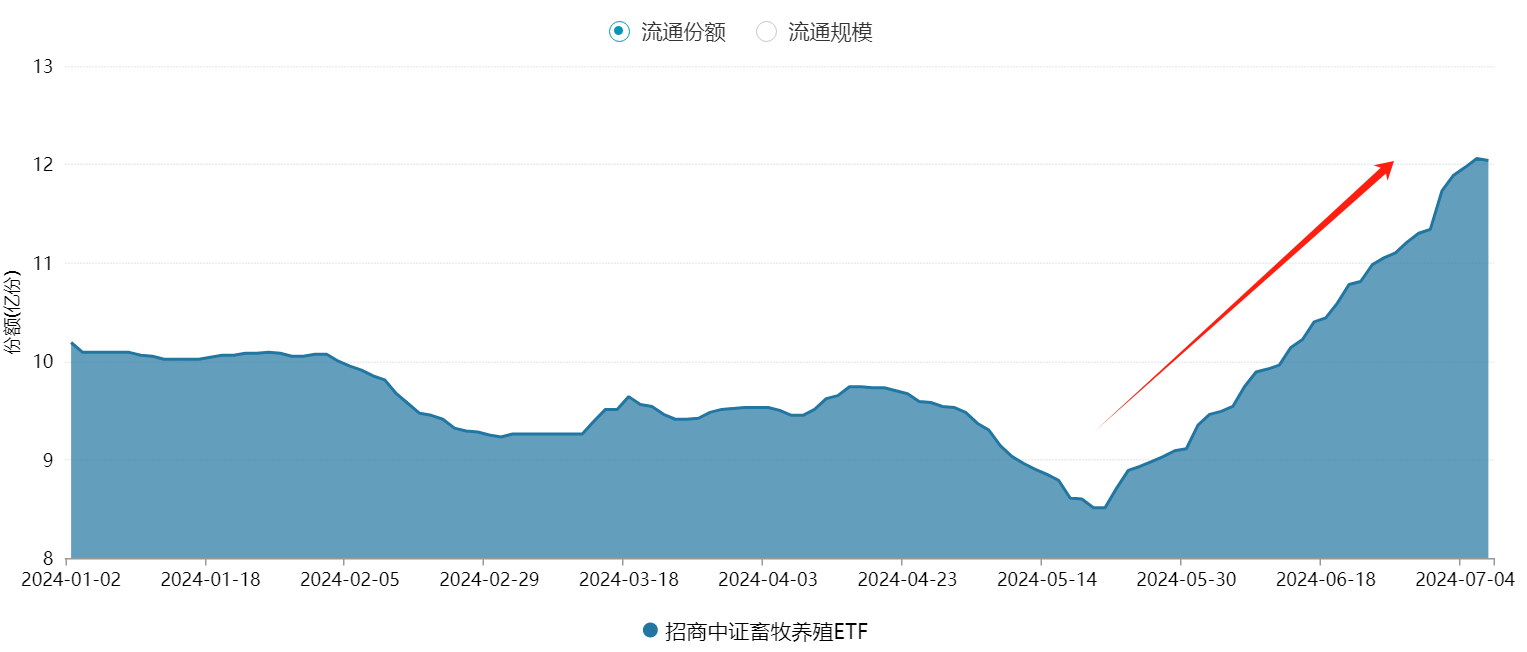 近期板塊調整過程中,資金持續流入養殖主題ETF。行情數據顯示,自5月22日至7月8日,畜牧養殖ETF(516670)份額累計增長3.53億份,增幅達41%,增幅位居同主題ETF第一,合計獲得資金淨申購近2.4億元。