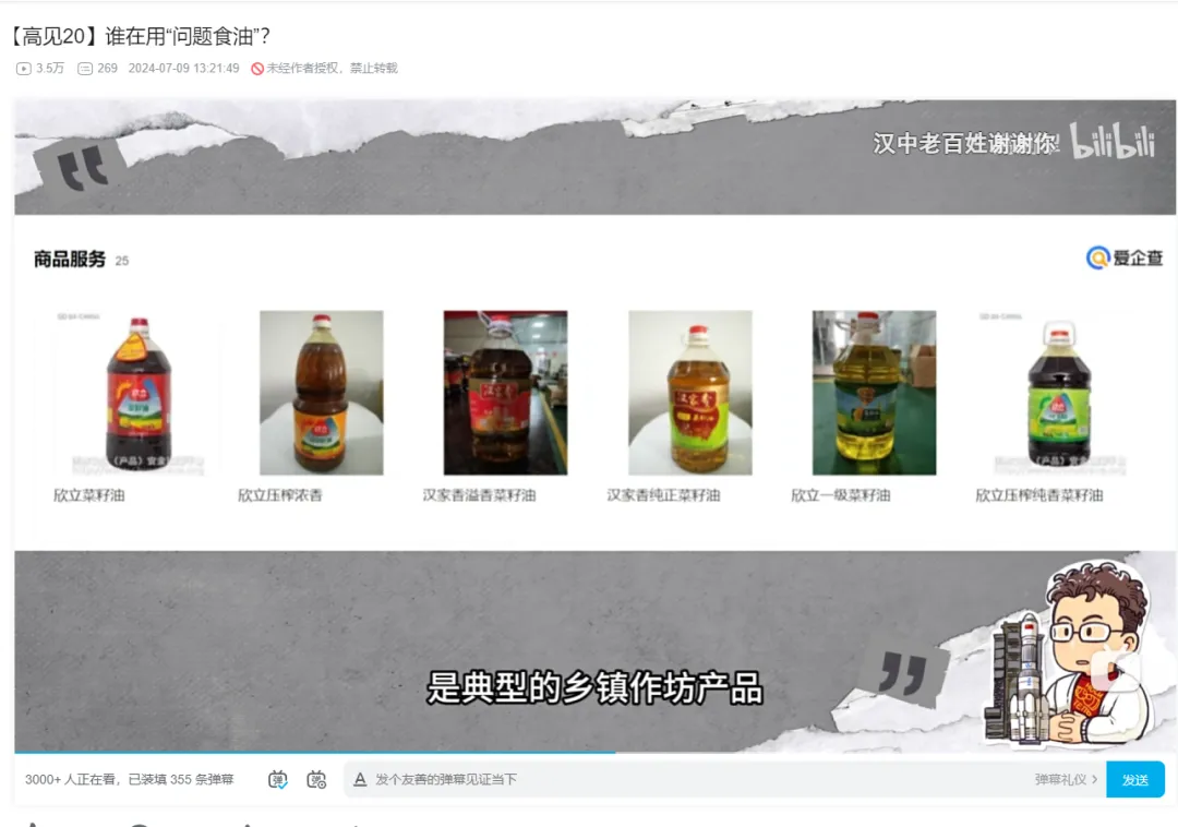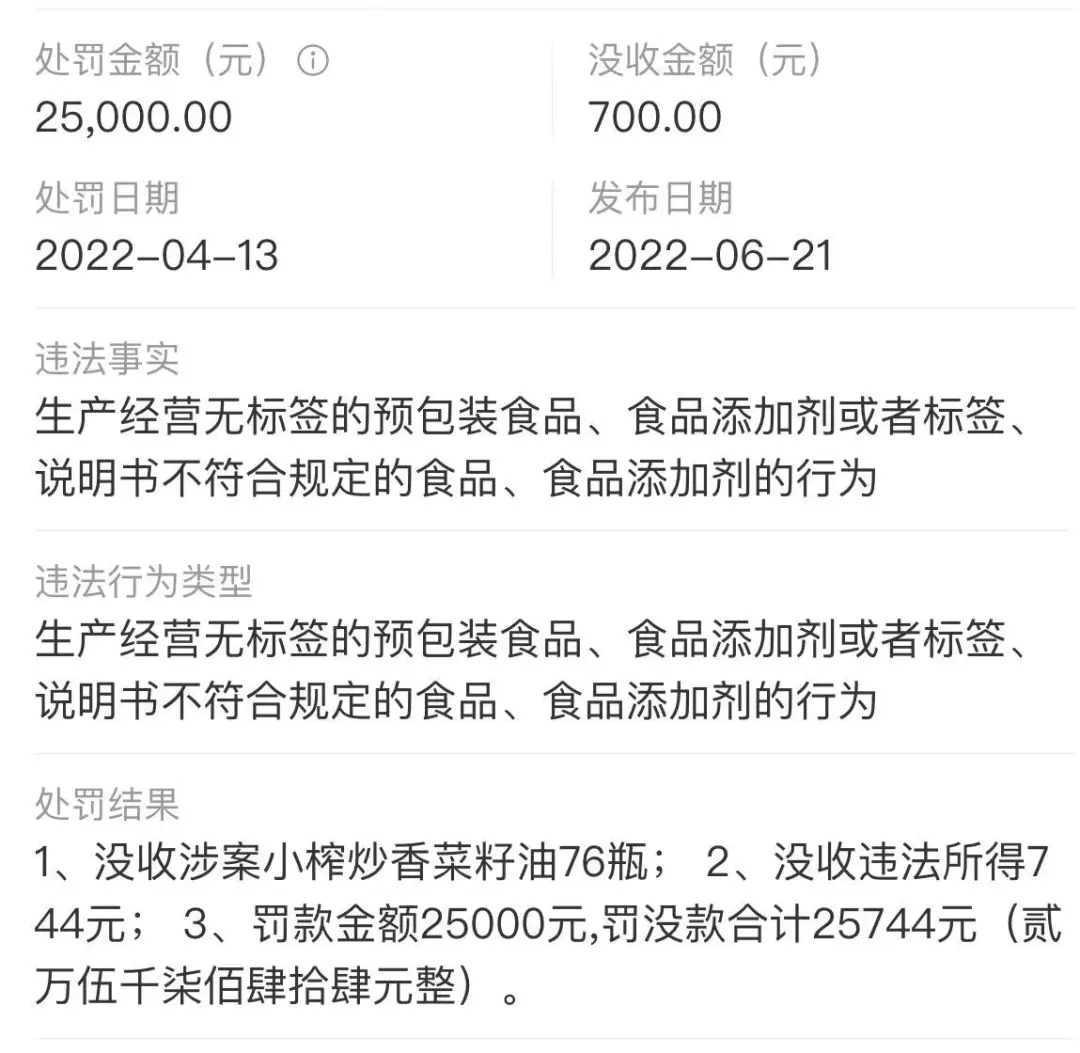 我查到他們2022年被行政處罰的公告,説是生產無標籤的預包裝食品,最後被沒收了76瓶菜籽油: