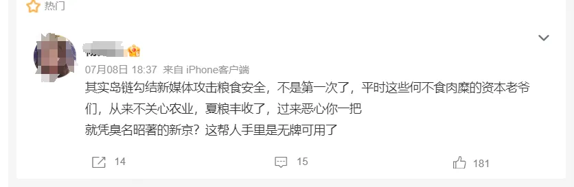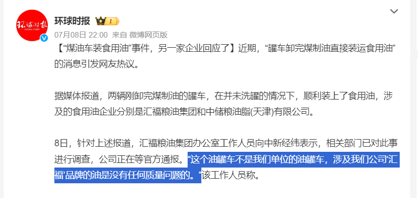 “大豆油也有工業用途,會不會這些大豆油根本就是被工廠拉去做工業品了,新京報故意隱去大豆油的去向,就是為了攻擊央企。”