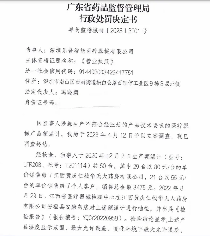 去年7月份,廣東省藥品監管部門對樂普醫療控股子公司深圳樂普智能醫療器械有限公司進行了處罰,因其生產的額温計經過檢驗多項指標均不符合相關規定,屬於不合格產品,要求該公司對不合格產品進行召回。