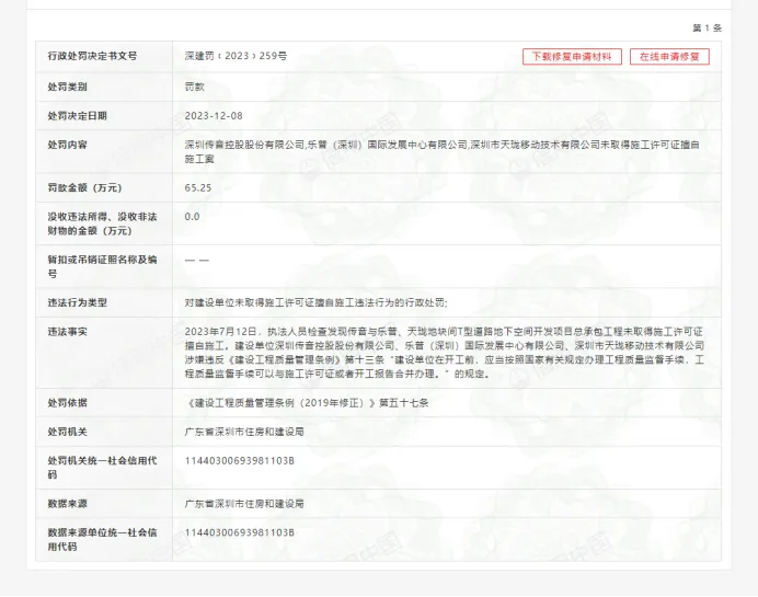 此外,**樂普醫療子公司還曾出現項目建設違規被罰的情況。**去年年底,樂普醫療在深圳的全資子公司樂普(深圳)國際發展中心有限公司在對該公司附近道路進行地下空間開發,在未取得施工許可證的情況下就擅自施工,被深圳市住建部門予以65.25萬元的行政處罰。