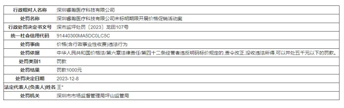 去年12月份,**樂普醫療控股的深圳睿瀚醫療科技有限公司因未標明期限開展價格促銷活動,涉嫌價格違法,**被深圳市坪山區市場監管部門予以處罰。