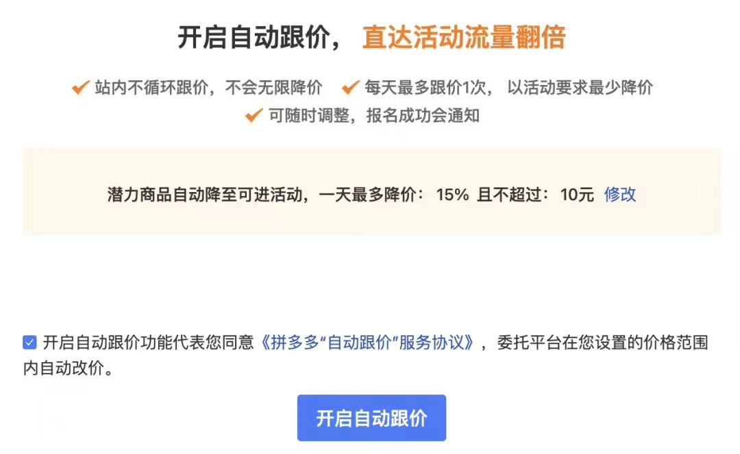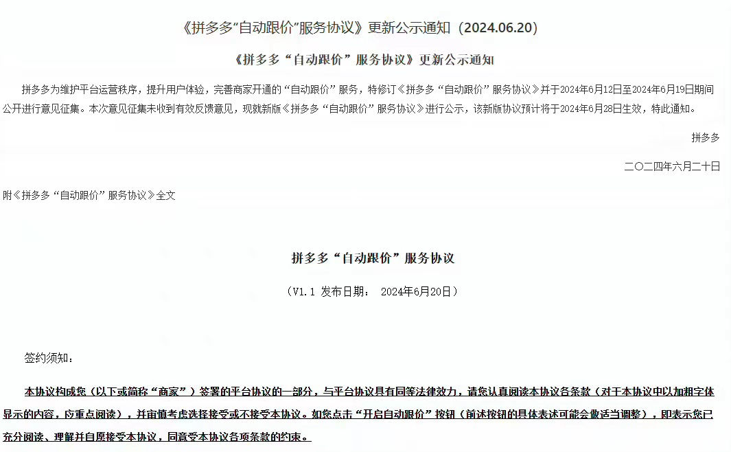 5月底,拼多多才面向商家推出了“自動跟價”這一新工具。6月20日,拼多多又發佈公告,宣佈對“自動跟價”服務進行調整,進一步擴大了平台權限,新協議已於6月28日正式生效。