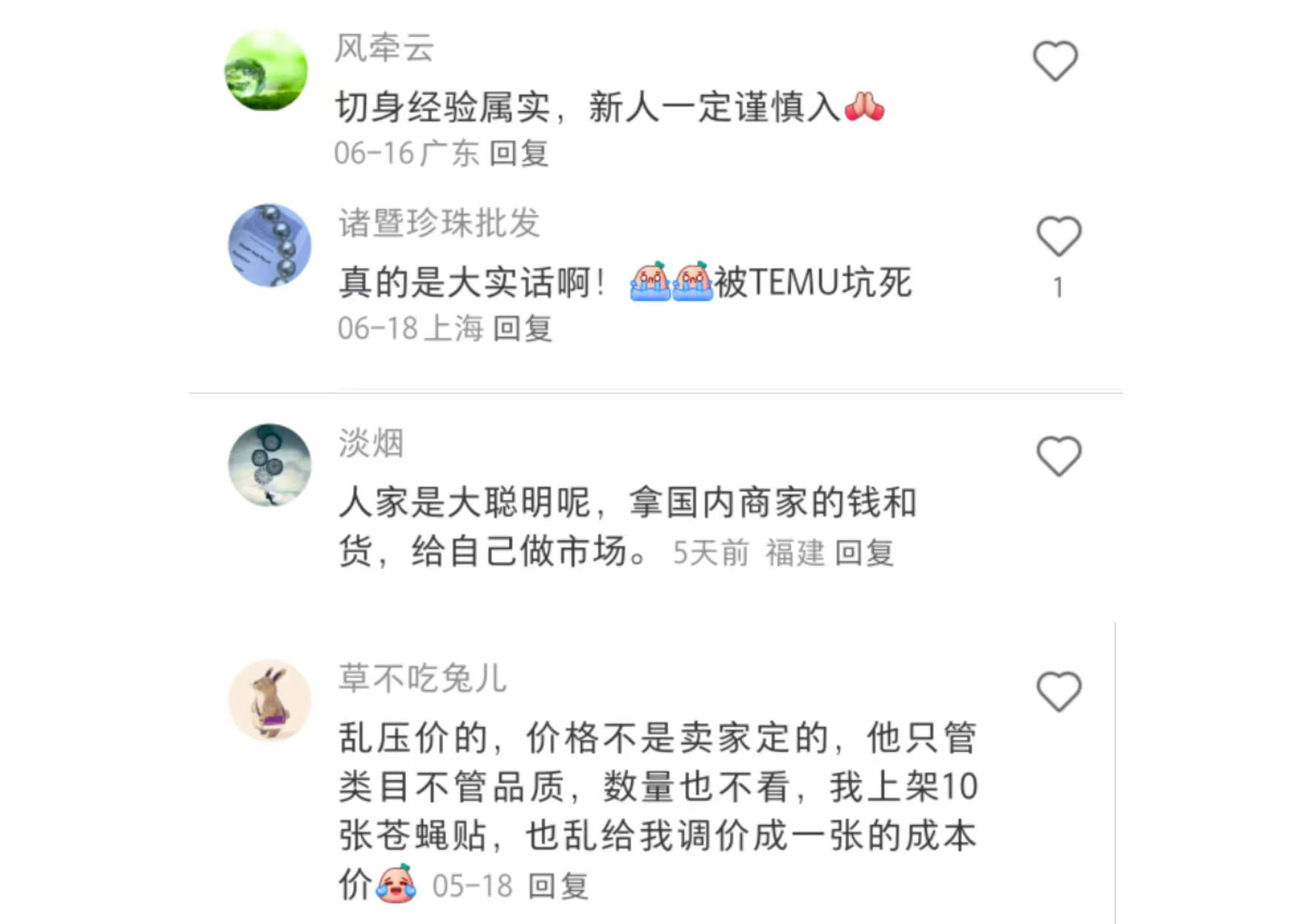 小紅書上有暱稱為“淡煙”的商家表示:“用國內商家的錢和貨,給自己做市場,太坑了”。商家“草不吃兔兒”則表示:“亂壓價,價格不是賣家定的,只管類目不管品質,數量也不看,十張的價格給我亂調成一張的成本價”。當然,更是有一部分商家表示:“新人慎入,勸退”。