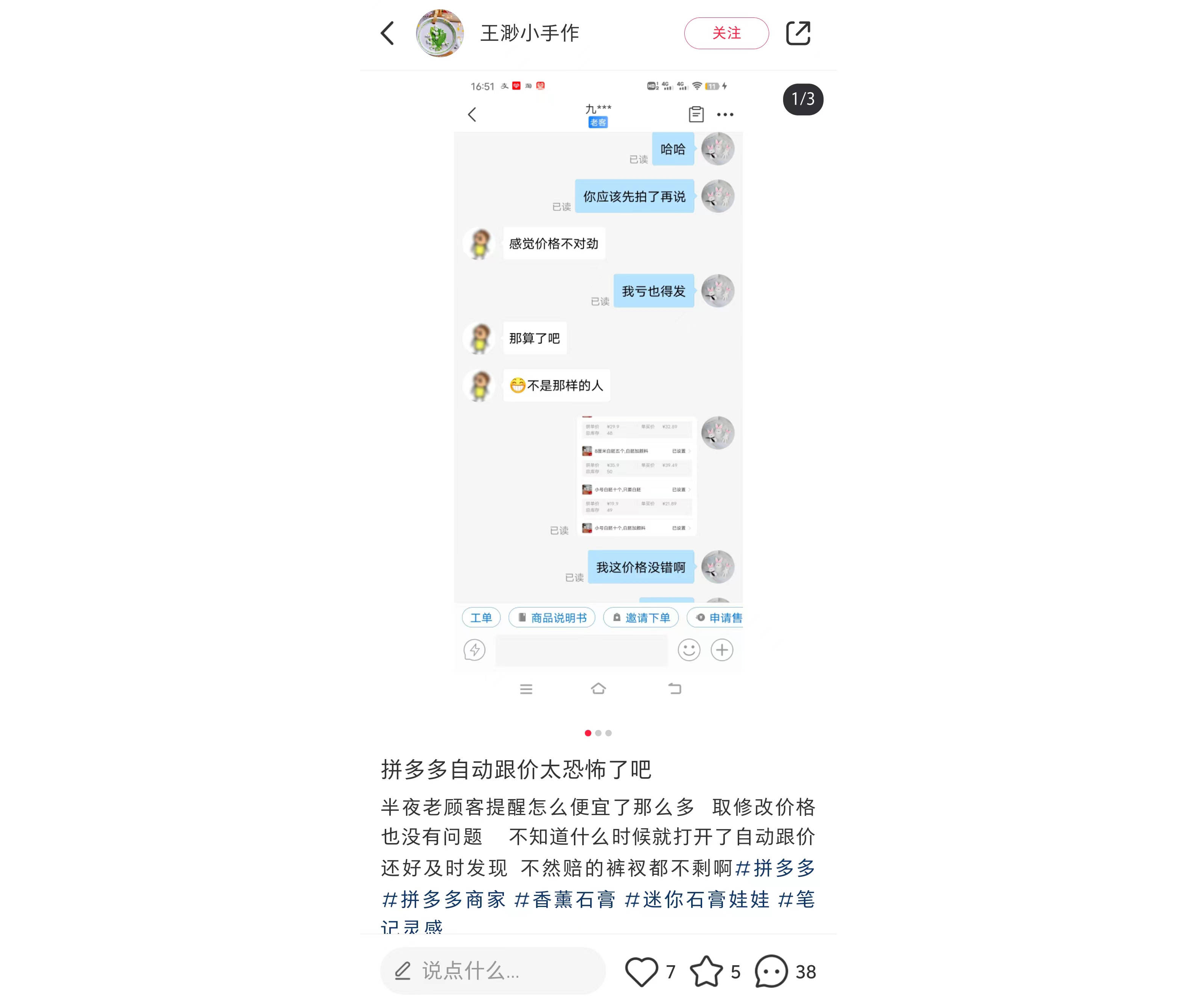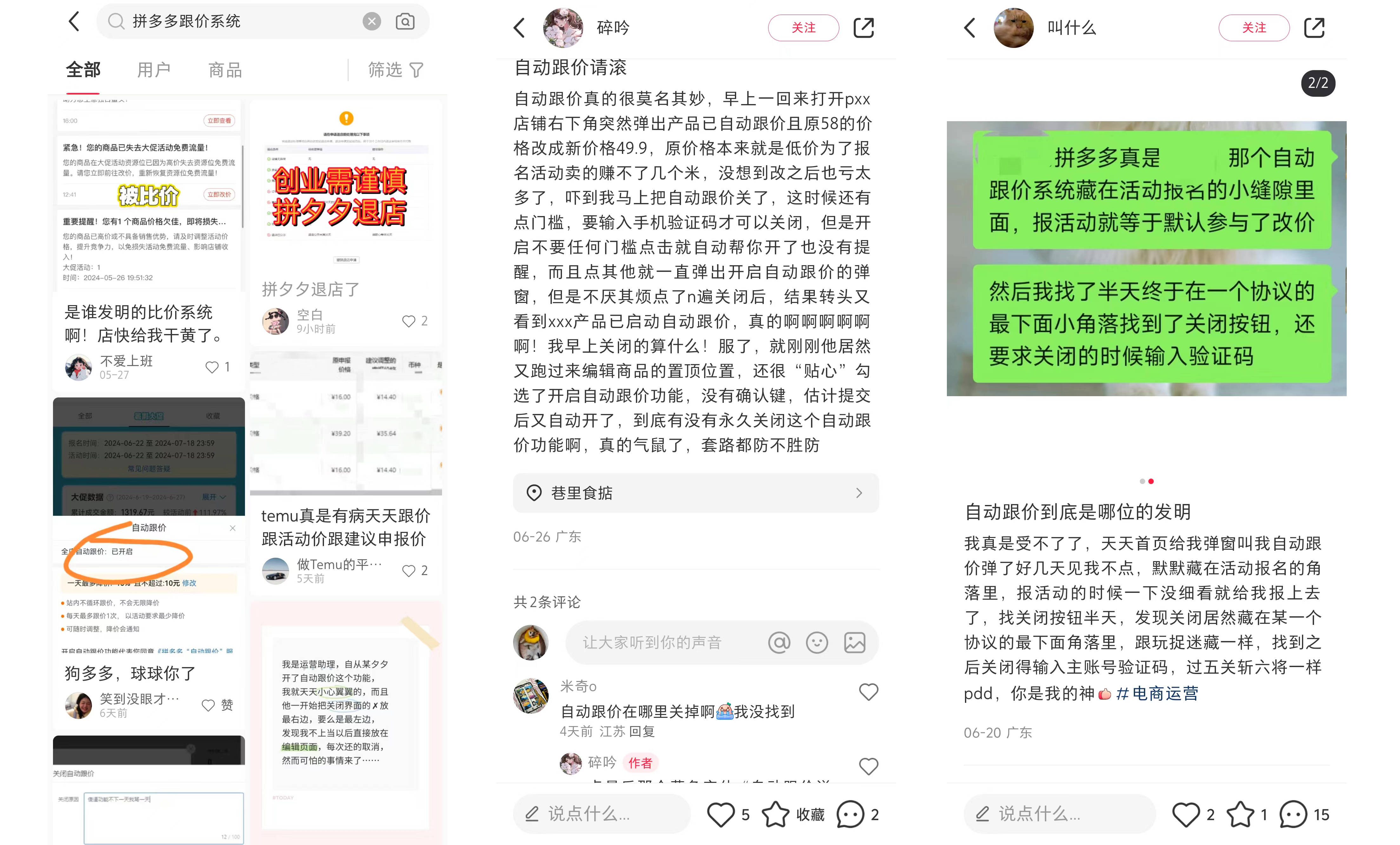 類似林東這樣的商家並不少,社交平台小紅書上有暱稱為“王渺小手作”的商家表示:“拼多多的自動跟價系統太恐怖了,不知道是什麼時候就打開了自動跟價系統,要不是老顧客發現提醒了,還不知道要賠多少錢。”