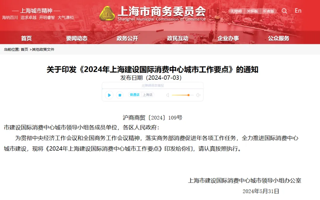 7月3日,上海市政府印發**《2024年上海建設國際消費中心城市工作要點》**。