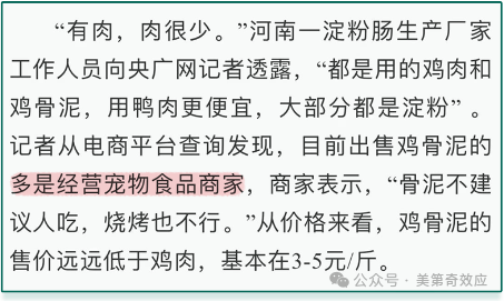 這種“曲筆”,當然不是第一次使用。就在幾個月之前,“澱粉腸塌房”事件當中,導致街邊攤的生意黃了一大片。很多媒體不斷炒作澱粉腸含“雞骨泥”,卻“有意無意”的忘了提,買“雞骨泥”做腸的,是寵物食品工廠。畢竟這腸如果是給狗吃的,這“新聞價值”可就被這買家信息給摧毀了。