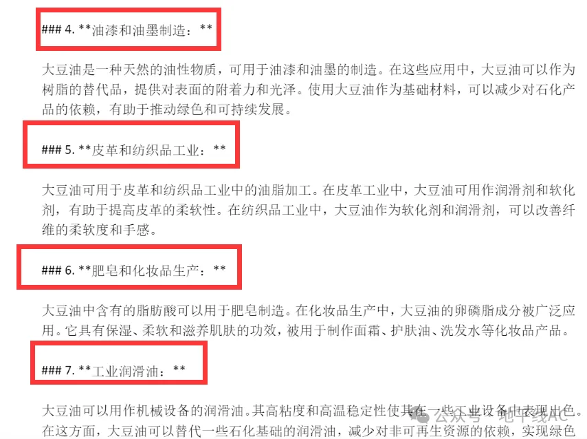 進一步查詢發現:大豆油的工業用途還真的很多,可以説是“渾身是寶”。可以用於油漆、油墨生產,還可以用於皮革產品、肥皂化妝品以及工業潤滑油。