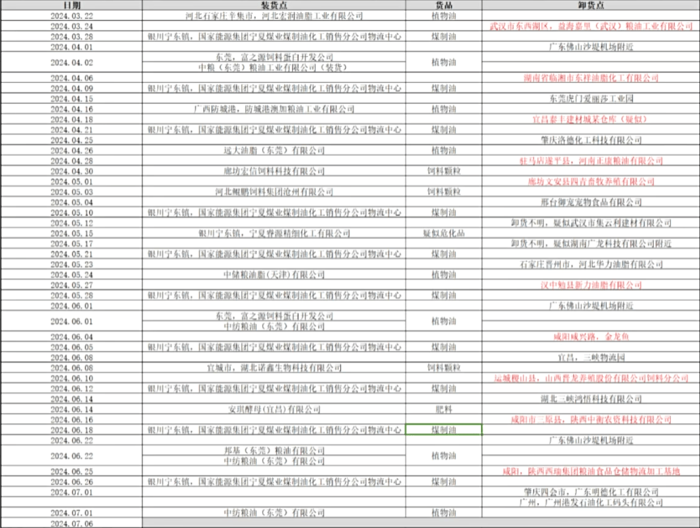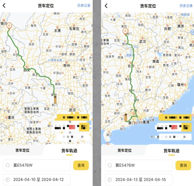 這輛罐車年後從3月 22 日開始跑單,第一站先是到石家莊辛集市,在河北宏潤油脂工業有限公司裝車植物油到武漢市東西湖區卸貨,之後直奔銀川寧東鎮裝煤制油,在國能寧煤物流中心裝完油後就掉頭南下,直奔廣東。之後幾個月,這輛罐車大部分時間都在跑這條南北線,區別主要是返程北上的時候裝卸食用油的地點不同。