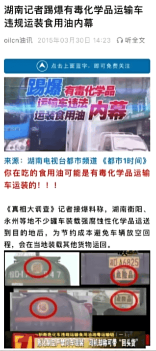 7月2日,新京報發了篇調查,揭露了國內普貨罐車的運輸亂象。很多普貨罐車既運食用液體,也運煤制油。新京報的調查喚醒了網友對食品安全問題的恐懼。上市企業第一時間自證清白,中儲糧宣佈開展專項大排查,匯福糧油集團也接受了有關部門調查。