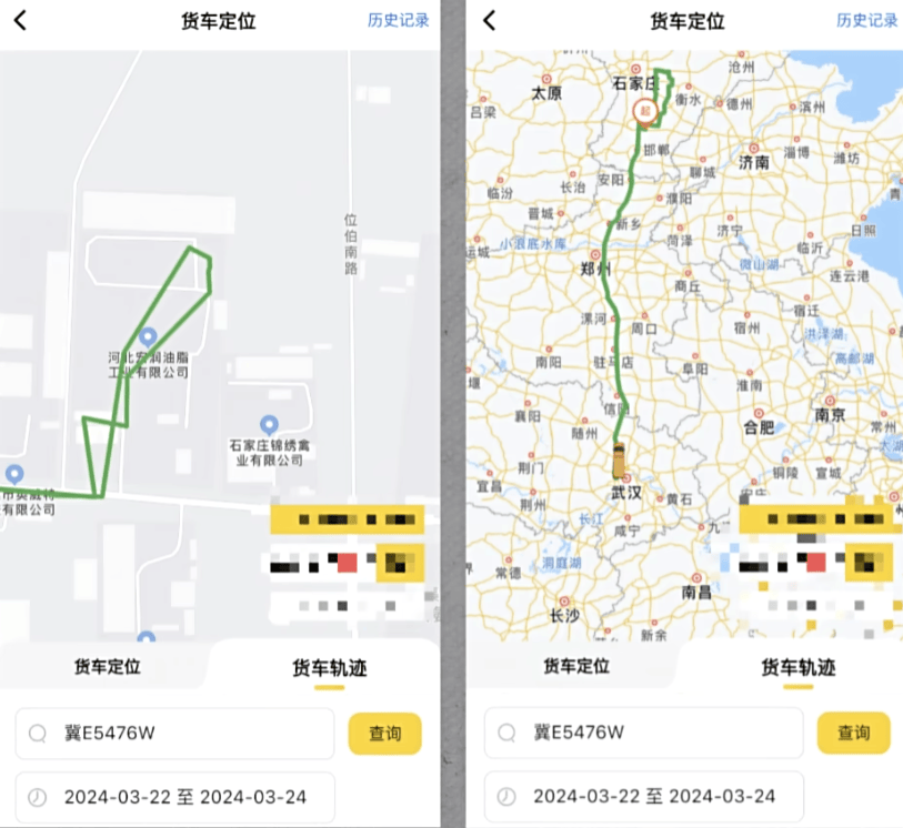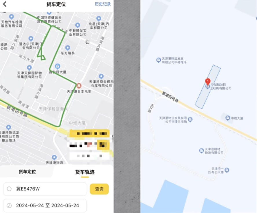 通過查詢罐車行車軌跡可以看到,冀E5476W 5 月 21 日在銀川寧東鎮的國家能源集團寧夏煤業煤制油化工銷售分公司物流中心,裝車煤制油,之後開往河北石家莊晉州市。5 月 23 日,罐車在石家莊晉州市的河北華力油脂有限公司卸貨,這部分對應了記者與司機的對話。