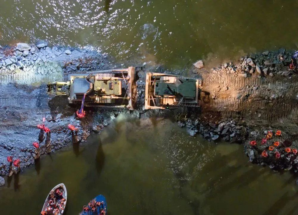 決口封堵現場,武警第二機動總隊某支隊推土機操作手、一級上士趙洪亮,把最後一車石料推入水中。昨晚22時31分,他駕駛的推土機剷鬥,與另一輛推土機剷鬥成功“握手”,團洲垸決口實現合龍!