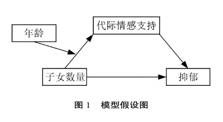 代際支持(intergenerational support)是指父母與子女之間互相提供經濟、生活上的照料以及雙方情感的交流和互動。與經濟支持和生活照料相比,代際情感支持(intergenerational emotional support)更不容易受到客觀資源條件限制,也是衡量代際關係的重要指標。基於社會情緒選擇理論(socioemotional selectivity theory),老年人高度重視情感上的滿足,因此會把更多的社交時間投入到可以滿足情感需要的活動中。照料與經濟層面上的幫助僅僅滿足了老年人在生活上的需求,而子女提供的情感支持重視並滿足了老年人內心的需求。**Becker和Lewis提出的子女數量 - 質量替代模型認為,子女數量和質量的提升都有可能實現父母效益的最大化,而父母對孩子數量和質量的需求是相互替代的,對孩子質量需求的增加意味着對數量的追求將會下降。****因此,作為子女質量的一種體現,代際情感支持對於老年人的情緒健康有更加積極的意義。**與該理論一致,聶建亮認為子女數量沒有對農村老年人的幸福感產生重大影響的關鍵因素可能在於代際支持。但是現有研究很少把代際情感支持因素單獨區分出來並作為中介變量考慮。有研究發現社會支持在子女數量對老年人幸福感的影響中起到正向的中介作用。因此,本文提出研究假設H1:代際情感支持在子女數量與老年人抑鬱水平的關係中起中介作用。
