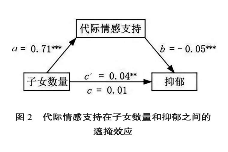 以子女數量和老年人的年齡為自變量,代際情感支持為因變量,在考慮控制變量之後得到自變量的方差膨脹因子小於 1.9,説明不存在共線性問題。有調節的中介效應分析表明(表2),子女數量對代際情感支持有顯著正向預測作用(p<0.001)。年齡對代際情感支持有顯著負向預測作用(p<0.001)。子女數量與年齡的交互項顯著預測了代際情感支持(p<0.001)。子女數量對抑鬱的正向預測作用顯著(p=0.007),代際情感支持對抑鬱的負向預測作用顯著(p<0.001)。老人的年齡調節了代際情感支持在子女數量和抑鬱之間中介作用的前半路徑。老年人的子女數量越多,越有可能得到更多的代際情感支持;高齡老人獲得的代際情感支持相對於低齡老人更少。