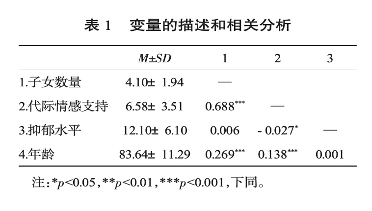 進行描述統計和偏相關分析。結果(見表1)表明,**子女數量與代際情感支持、年齡之間均呈現顯著的正相關;代際情感支持和抑鬱水平之間存在顯著的負相關,**和年齡之間存在顯著的正相關;其餘相關關係不顯著。