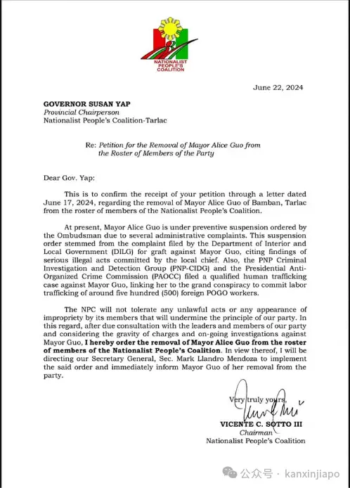 由前參議員Vicente “Tito” Sotto III領導的菲律賓民族主義人民聯盟決定將備受爭議的塔拉克省班班市市長郭華萍除名,不再擔任該政黨的成員。