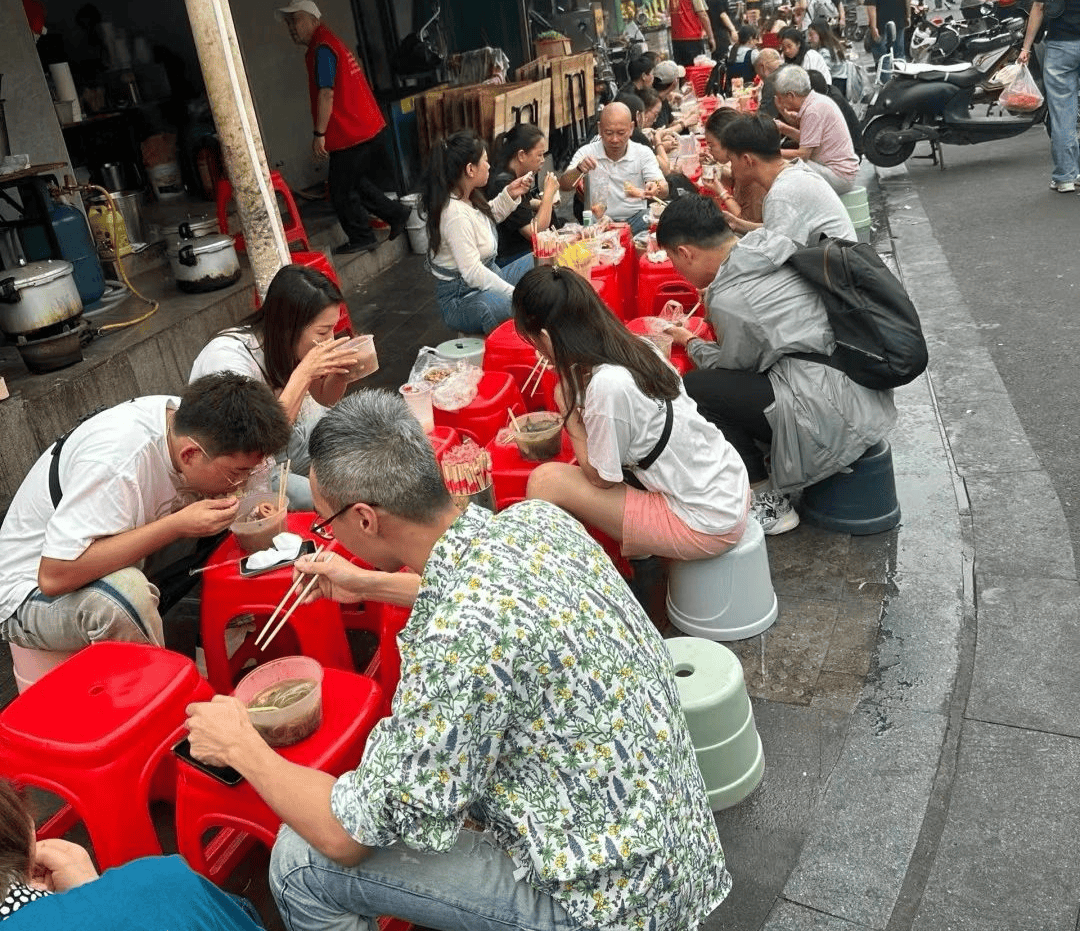 是不分性別年齡地坐在路邊吃東西,沒有構圖擺拍,只有對美食的享受;