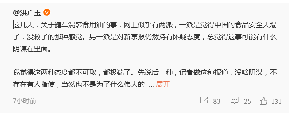 這幾天,關於罐車混裝食用油的事,網上似乎有兩派,一派是覺得中國的食品安全天塌了,沒救了的那種感覺。另一派是對新京報仍然持有懷疑態度,總覺得這事可能有什麼陰謀在裏面。