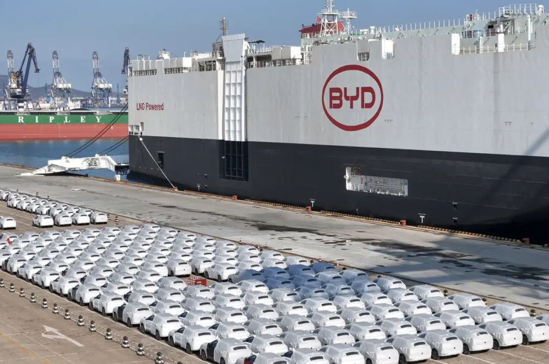 2024年1月10日,比亞迪探險者1號汽車運輸船在中國山東省煙台港裝載新能源汽車出口(圖源:Getty image)
