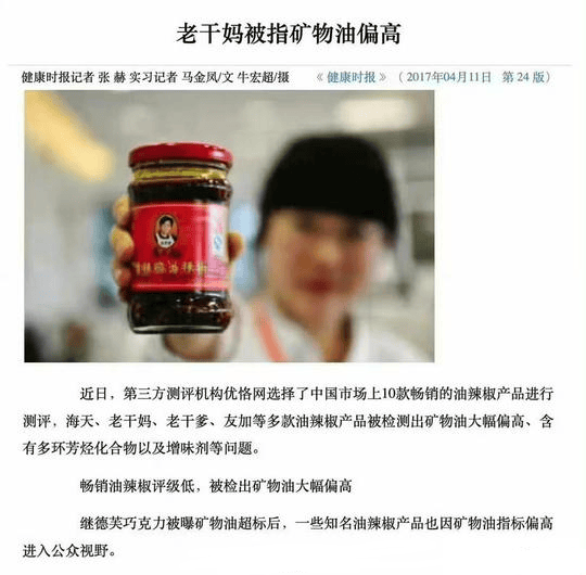 當時的國內媒體不經調查,就一口咬定,食品公司添加礦物油,可以延長保質期,降低成本,卻對人體具有致癌性危害,條條罪狀都指向了老乾媽和海天。可老乾媽、海天懵了,自己遵紀守法,老老實實地生產、銷售辣椒油,也從未主動添加礦物油,怎麼就礦物油超標了呢?面對洶湧輿論,各大媒體的批評與職責,老乾媽、海天也只能認栽,產品下架,拉回去整改,損失慘重。
