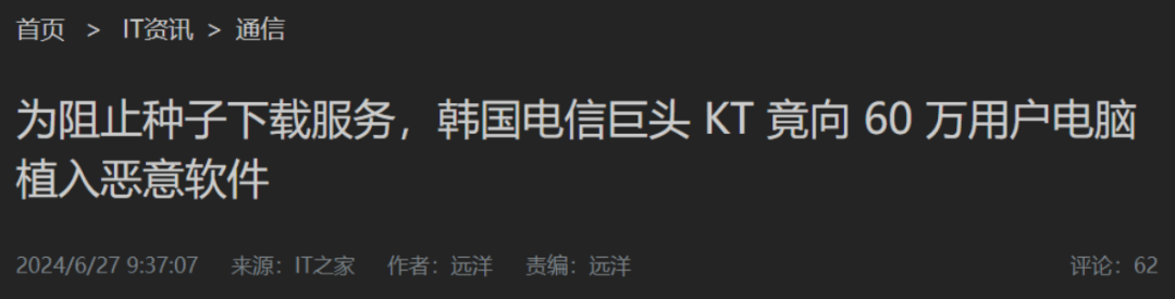 IT之家,為阻止種子下載服務,韓國電信巨頭 KT 竟向 60 萬用户電腦植入惡意軟件
