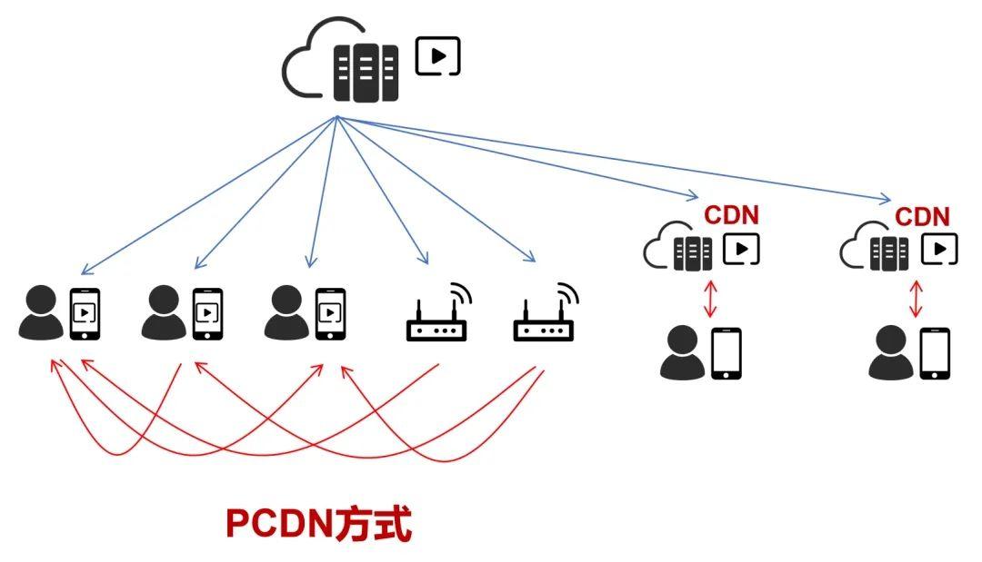 而 PCDN 呢,則是 CDN 的超級無敵進化版本,它已經不滿足於區域服務器了,而是直接把用户的手機、路由器啥的都變成了它的內容源。
