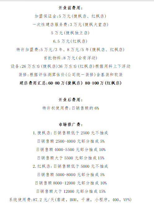 李麗提供給時代週報的加盟文件顯示,標準典型紅楓店的建店總費用為80萬元-100萬元,小面積的捷楓店的建店總費用在60萬元-80萬元,開業後還將收取特許權使用費(日銷售額的6%)以及市場推廣費等費用。