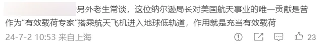“説起納爾遜這個人啊,雖説他是NASA的現任局長,但他對美國航天事業的唯一貢獻,想來也不過是曾以‘有效載荷專家’的身份,搭乘航天飛機進入地球低軌道而已。啥叫‘有效載荷專家’啊,説白了他就是那個‘有效載荷’。”