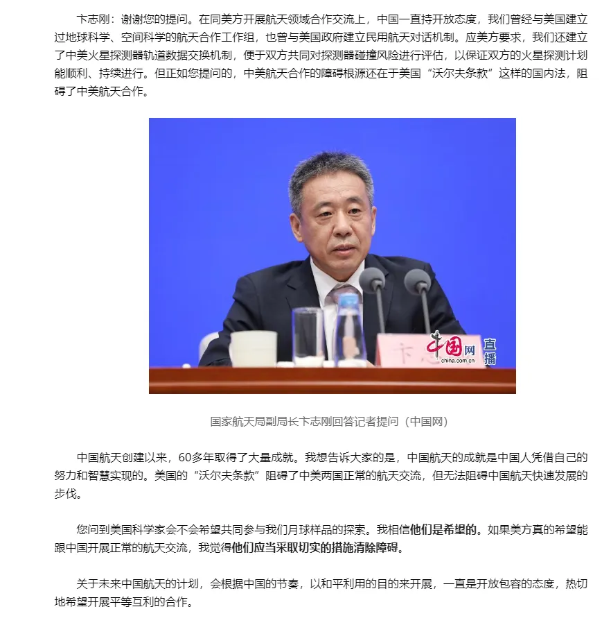 “在同美方開展航天領域合作交流上,中國一直持開放態度……但正如你提問的,中美航天合作的障礙根源還在於美國《沃爾夫條款》這樣的國內法,阻礙了中美航天合作……我想告訴大家的是,中國航天的成就,是中國人憑藉自己的努力和智慧實現的。美國的《沃爾夫條款》阻礙了中美兩國正常的航天交流,但無法阻礙中國航天快速發展的步伐。”