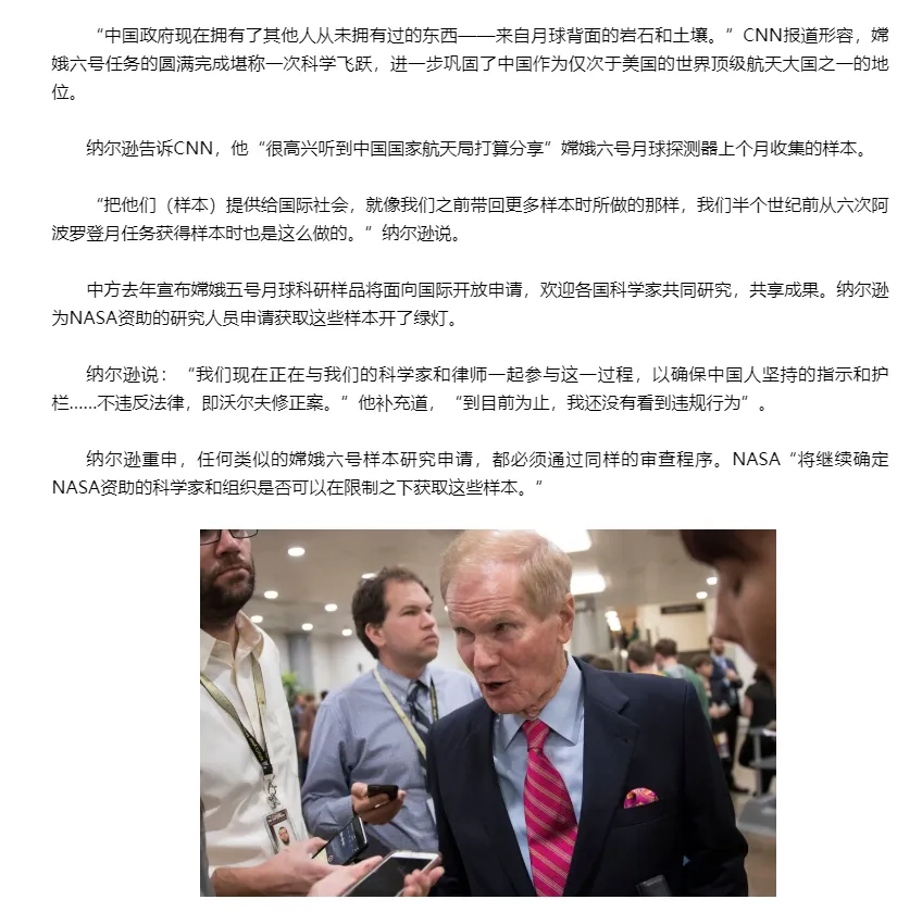 “看到中國宣佈願意和世界各國分享他們從月球背面採回的土壤樣品,我們表示很是欣慰。此等海納百川,有容乃大的君子胸襟,頗有我們美國當年同全世界分享‘阿波羅’計劃月壤的紳士雅量。“