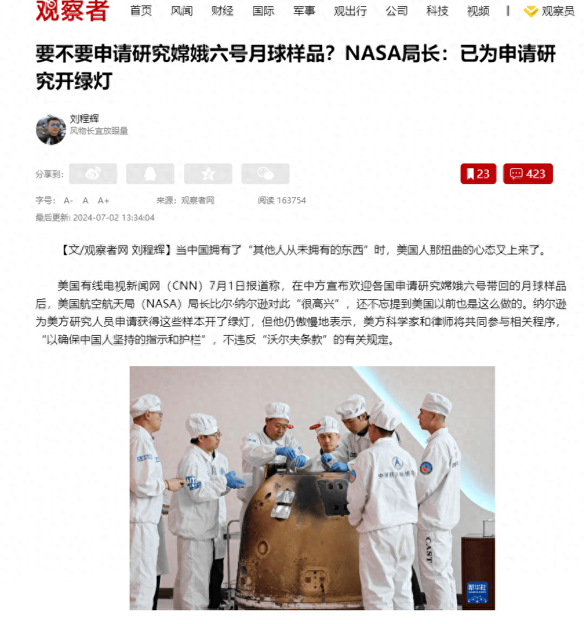 納爾遜巴拉巴拉扯的這些美國官八股,翻譯成人話,意思就是:NASA已經就獲取嫦五月壤樣本的事宜向中國提出申請了,嫦六這回大概率還得接着管我們要。雖然《沃爾夫條款》的確是一項美國針對中國製定的、嚴格限制中美展開航天技術交流合作的反華法案,但這畢竟是一項美國人自己制定的法案,所以最終解釋權歸美國人的嘴巴所有。