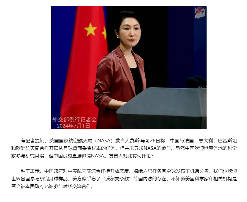 “NASA發言人費斯·馬可在6月28日宣稱,中國與法國、意大利、巴基斯坦和歐洲航天局合作開展從月球背面採集樣本的任務,但並未尋求NASA的參與。雖然中國歡迎世界各地的科學家參與研究月壤,但中國沒有直接邀請NASA。請問發言人有何評論?”
