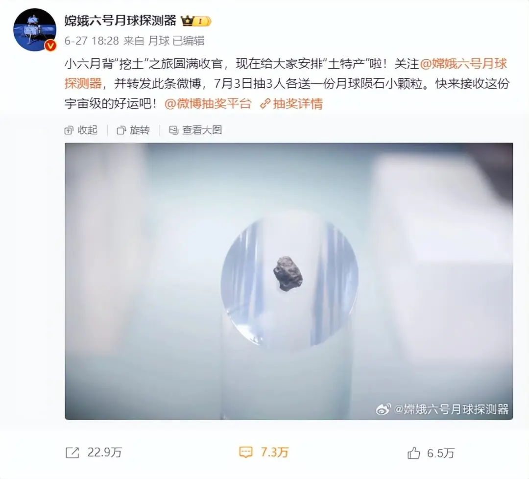 誒,你別説,你還真別説。在六姑娘把土特產帶回來之後,@嫦娥六號月球探測器的官方微博還真就發了條抽獎動態。説是為了慶祝嫦六攜帶月背土壤樣本平安歸來,@嫦娥六號月球探測器要在轉發區裏抽出3位幸運的吃瓜羣眾,每人贈送一顆月球隕石小顆粒。