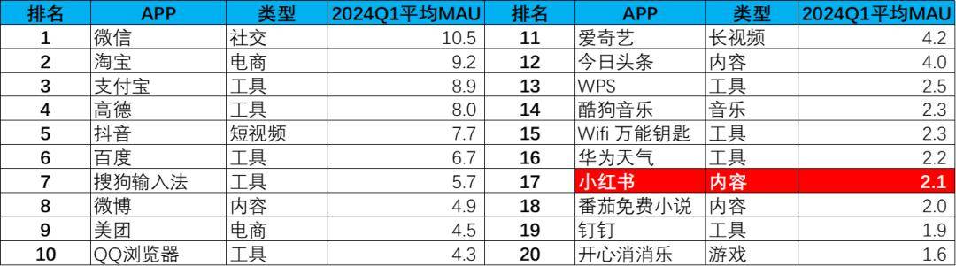 圖:2024春季賽道用户規模TOP1 APP月活榜單,來源:Questmobile 錦緞整理