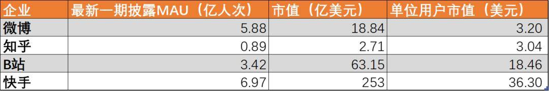 以與小紅書相近的4個已上市內容社區標的為例,單位用户價值(市值/MAU)較低的微博和知乎,相對應的商業模式價值係數更低。