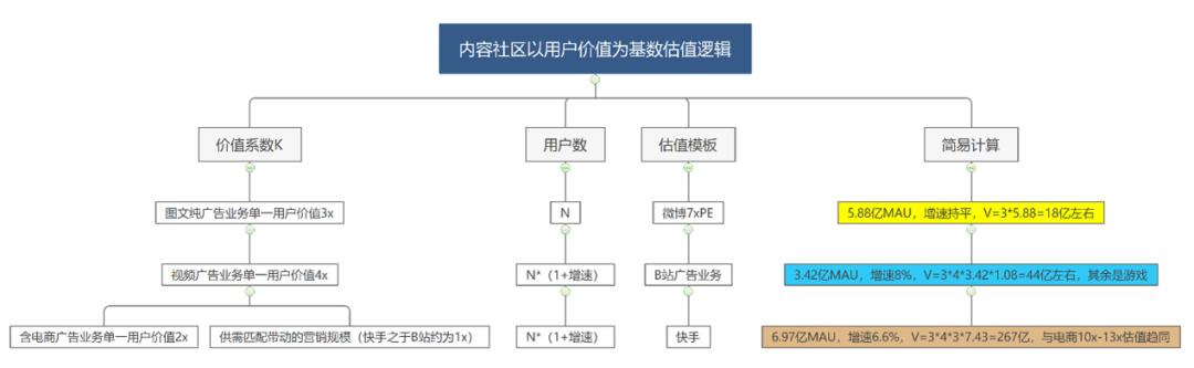 我們認為,核心還是在商業模式協同和用户規模增速上,商業模式協同越高、增速越快估值越高(短視頻之於圖文,拼多多之於傳統電商),因此更傾向於另一種表達: V=K*K1...*N*(1+用户增速)。