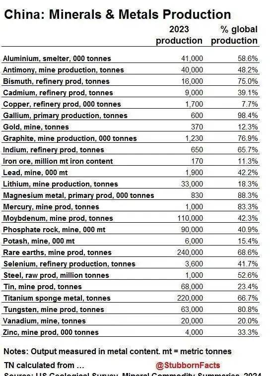 這份結論的依據來自於美國地質調查局提供的一張表。從表中可以看到,中國在諸多關鍵金屬及製成品的產量上遙遙領先於美國。例如,2023年中國的發電量是美國的兩倍,鋼鐵產量是美國的12.6倍,水泥產量是美國的22倍。中國造船廠生產的船舶總噸位超過全球產量的50%,汽車產量達到了3020萬輛,是美國的三倍。