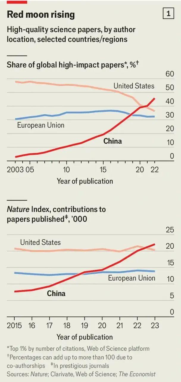 “2022年以來,中國的高被引論文佔比已經比歐盟或美國都要多。2023年,中國高質量論文數首次超過了美國。根據引文統計,世界上約40%的論文是中國學者發表的,美國貢獻了大約10%,歐盟和英國加起來發表了15%。中國在物理學、化學、工程學、地球和環境科學領域領先世界了”。