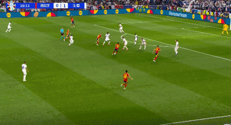 西班牙中場拉弓+兩翼飛箭,讓兩肋有足夠操作空間。核心是中後場出球羣,以及左右兩飛:左尼科、右亞馬爾,雙逆足內切威脅,讓庫庫雷拉們可以左右套邊製造威脅;羅德里和雙中衞出球,莫拉塔接應,法比安肋部插上,佩德里遊弋——他受傷後,奧爾莫頂上。