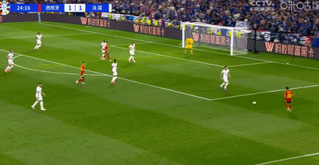 今天西班牙開場策略正確,第一個射門就是左路下底,橫傳右路,亞馬爾起球傳中,法比安頭球頂飛。這個左右橫傳,敲中法國的破綻。