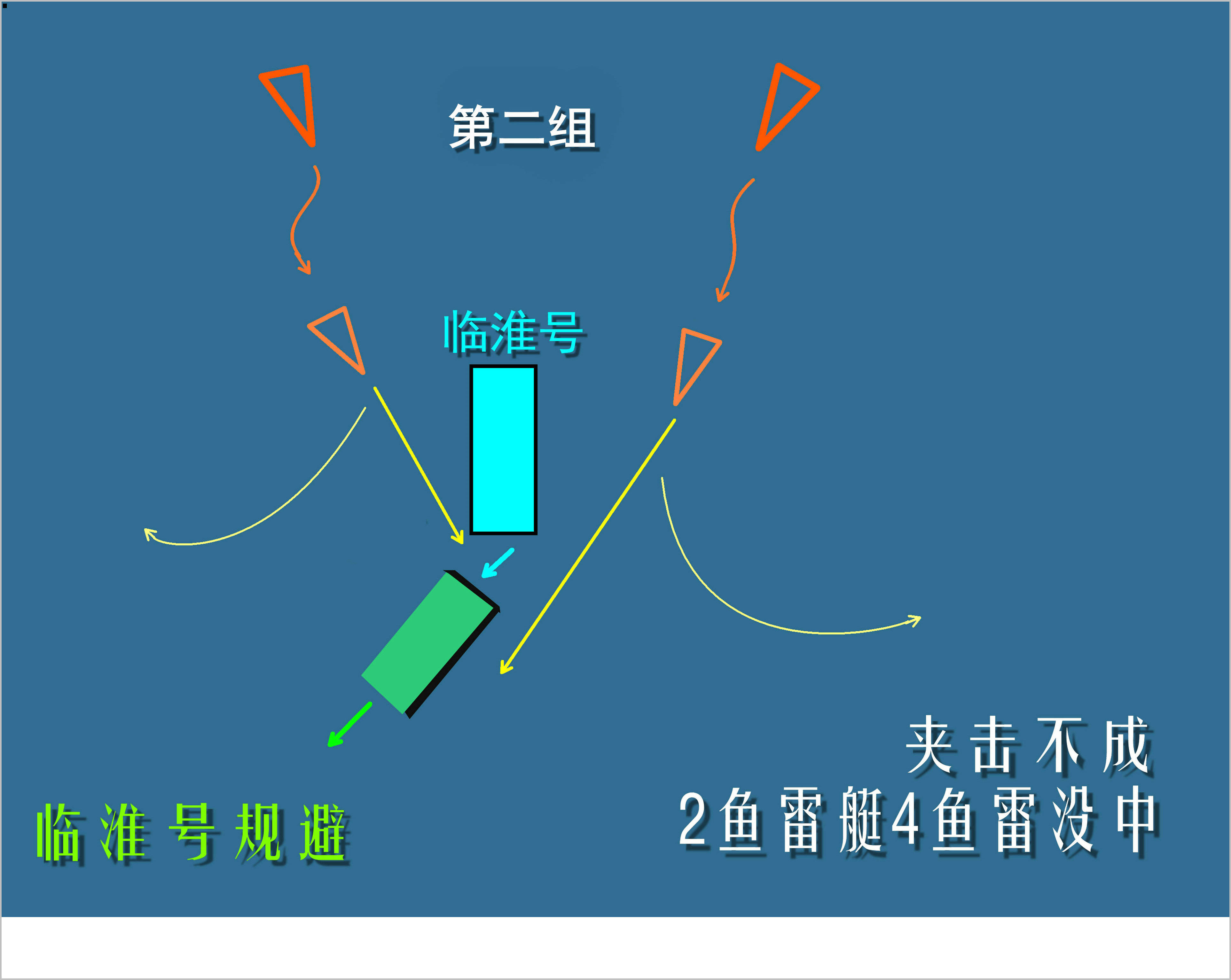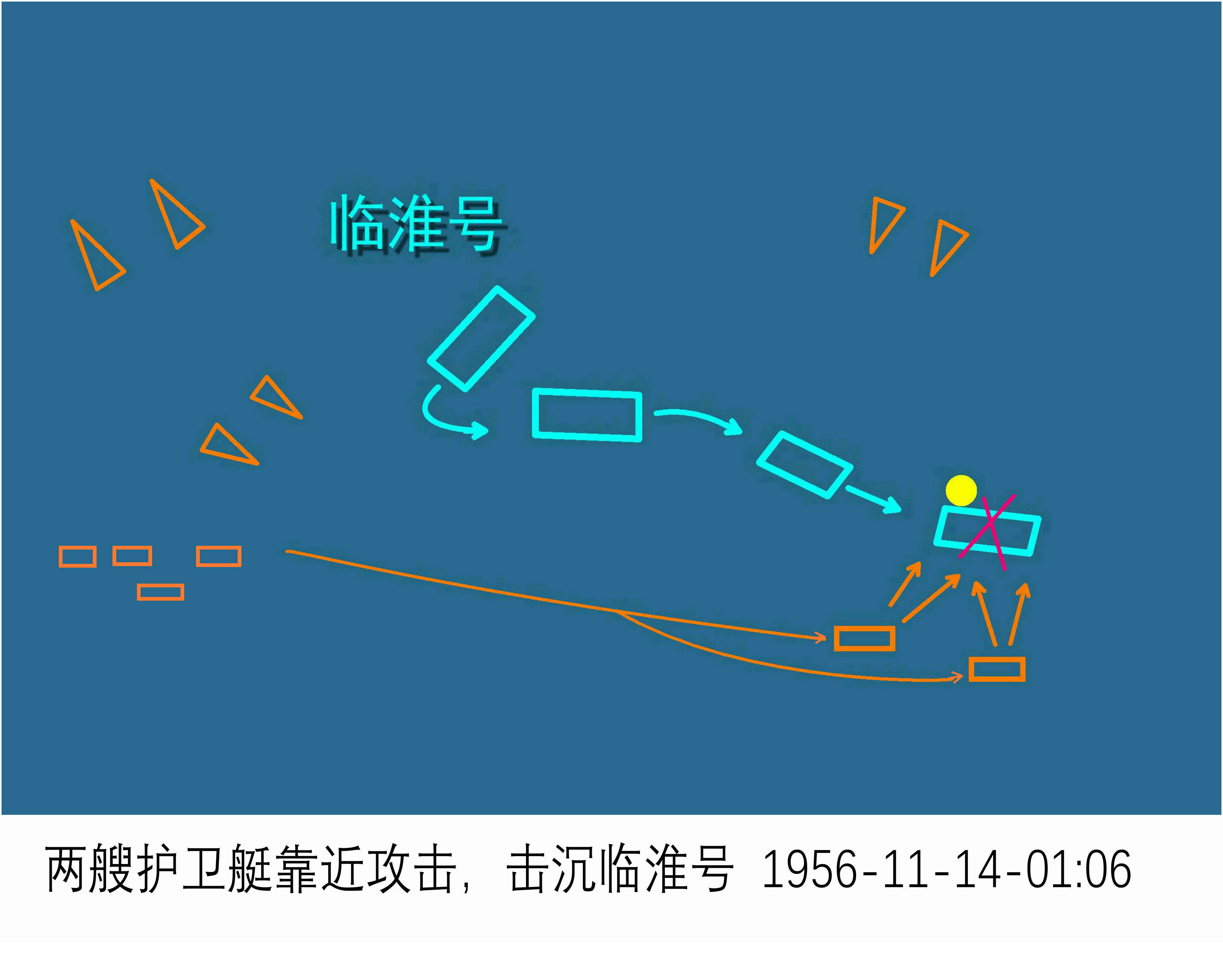 魚雷艇羣冒着密集炮火高速追擊,反覆搶佔有利攻擊陣位,於14日零時31分,逼近至距“臨淮”號約300米處發射魚雷,命中其尾部,該艦當即失去機動能力,開始下沉。