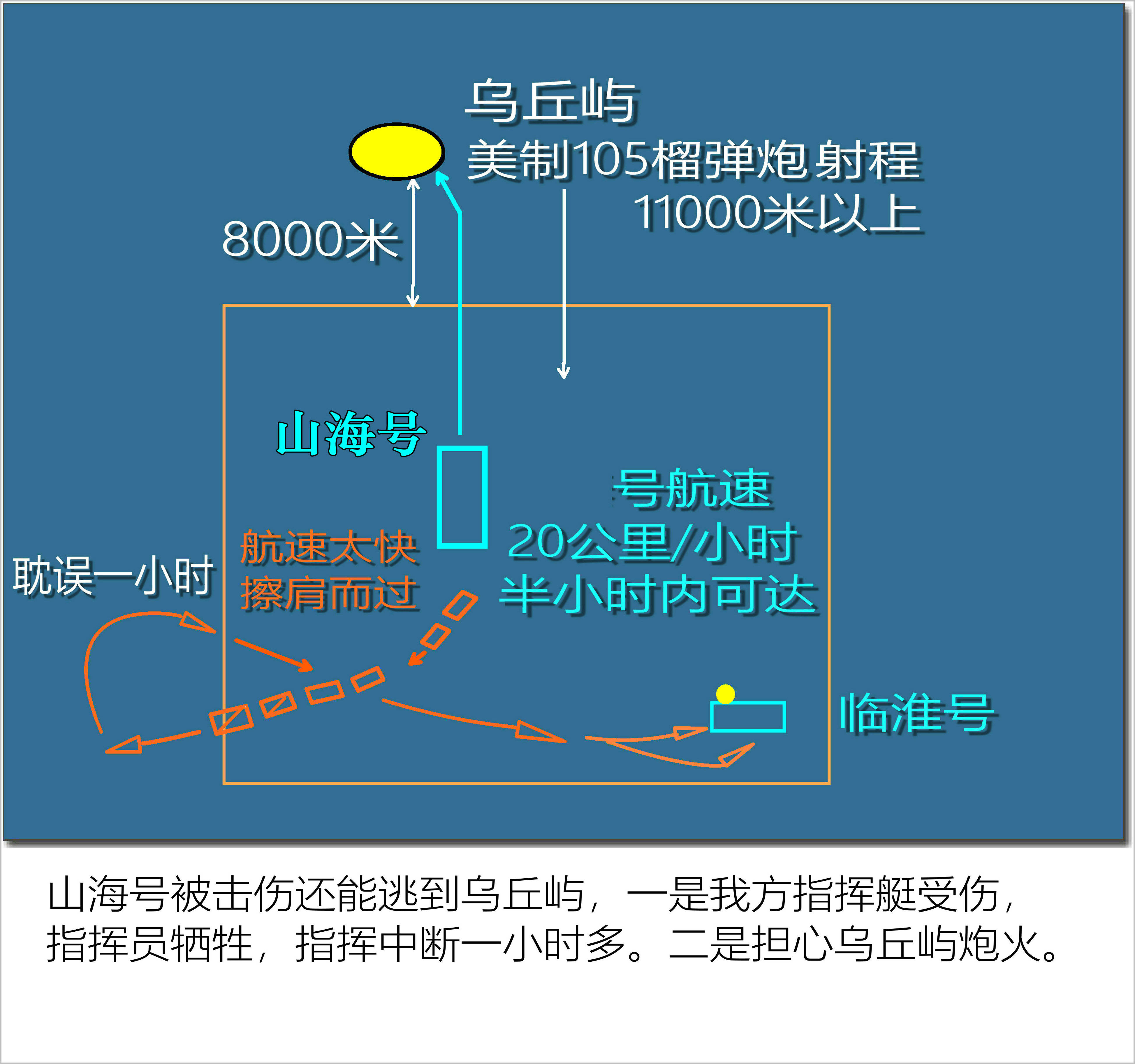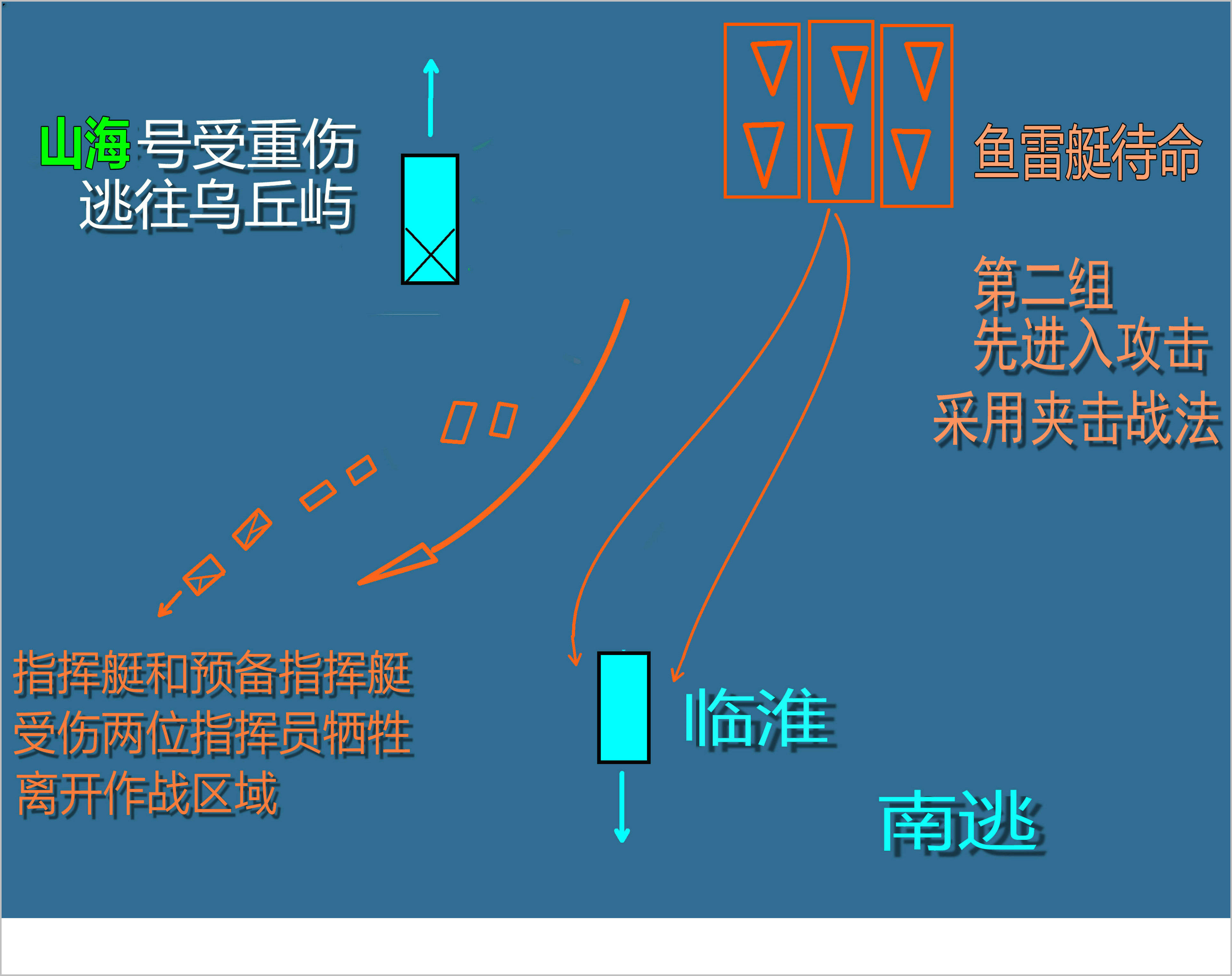 22時16分,編隊奉命出擊,在岸上指揮所引導下,及時發現目標。23時33分,護衞艇羣距“臨淮”號和“山海”號0.5海里時突然開火,“山海”號中彈後倉皇逃往烏丘嶼。