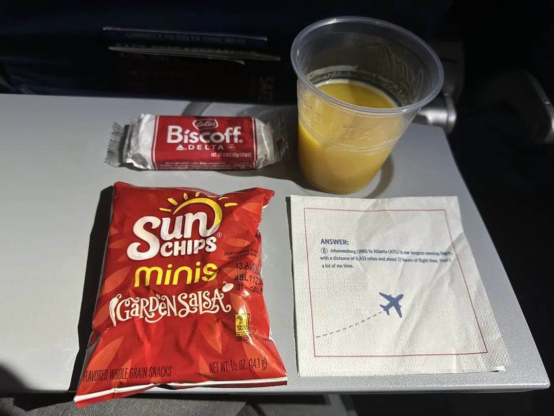 起飛時間五點半,怎麼算也是飯點,但這個航班只有一個小吃,chips或者cookie二選一,很小很小,兩口吃完。