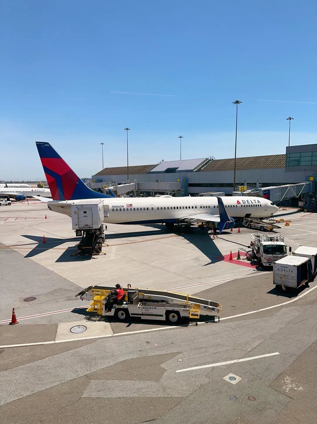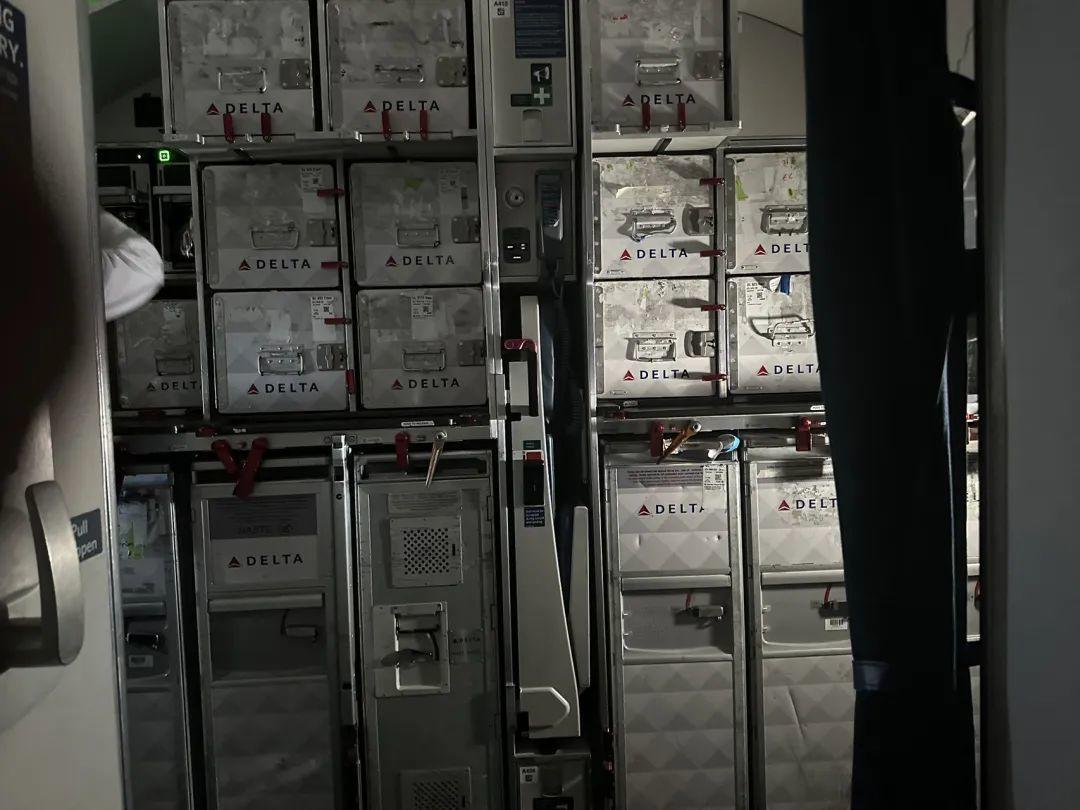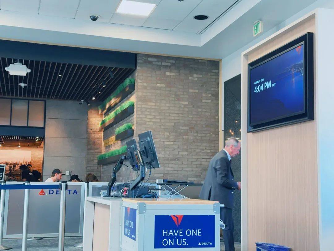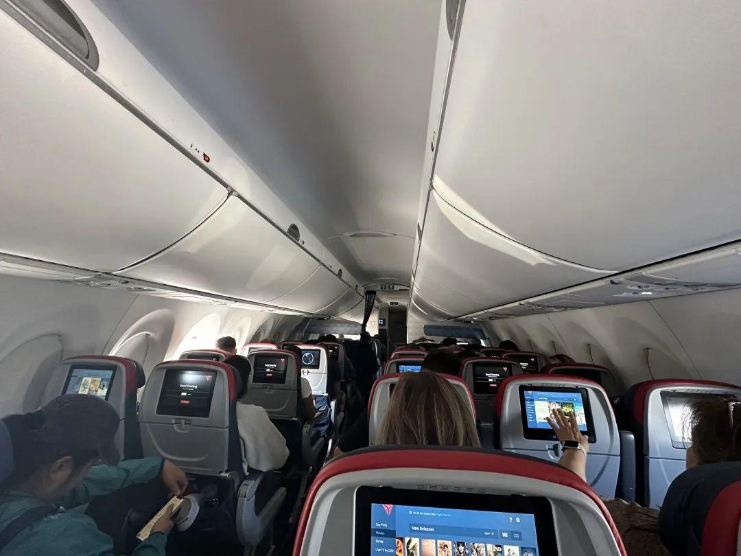今天的機型是空客A220,只有三個乘務員,達美航空的空乘自然是鬆弛感拉滿,客艙温度有點低,前艙的那位女乘務長在制服外面又套了個薄羽絨服,抱着膀子,用那種“美式笑容”説歡迎登機。