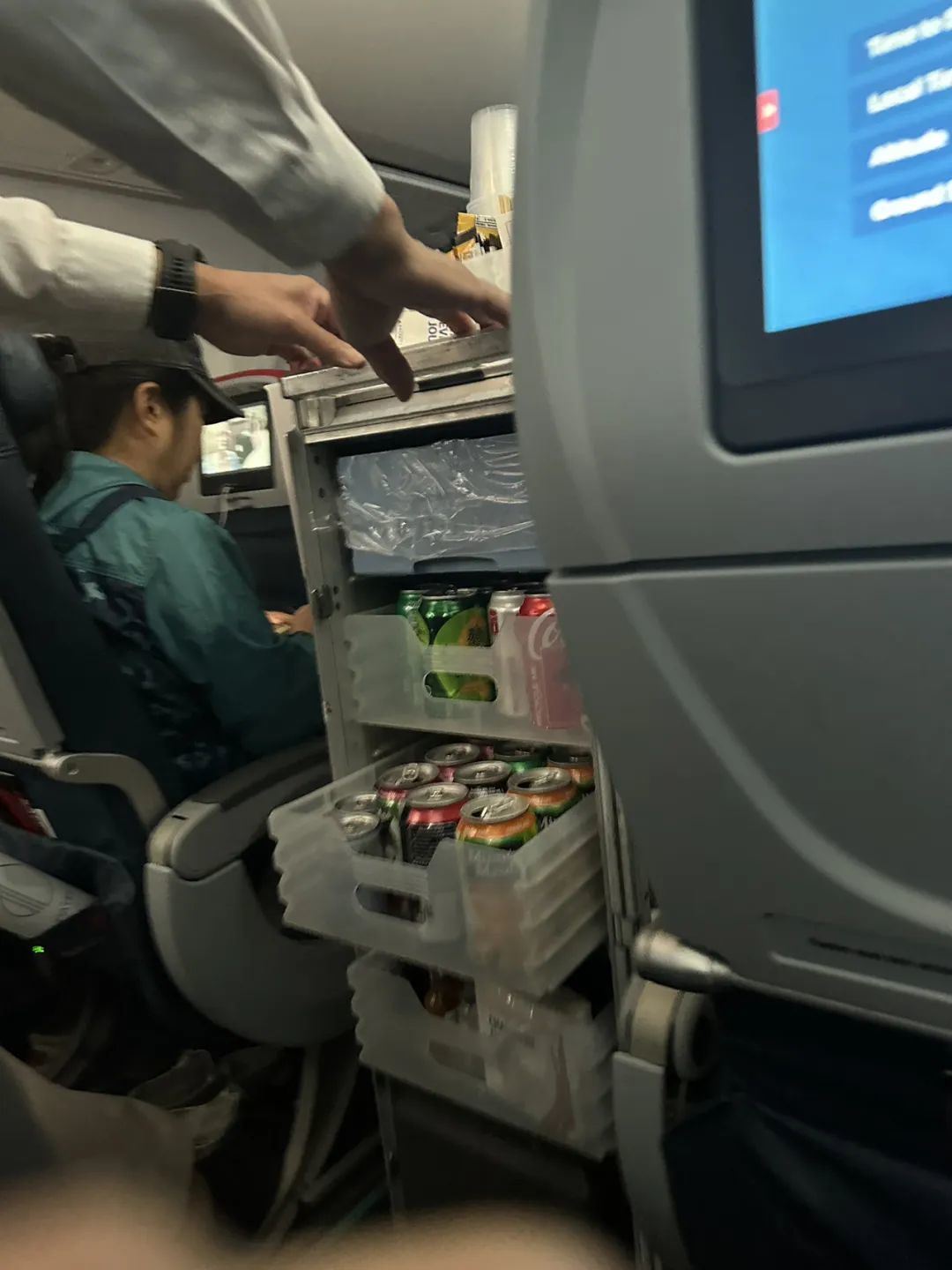 17:53分,兩位男乘推着餐車從我旁邊經過,上面擺着大瓶礦泉水,送到我這一排時,我才發現餐車裏面擺着的飲料品種很豐富,而且都是小瓶裝的。